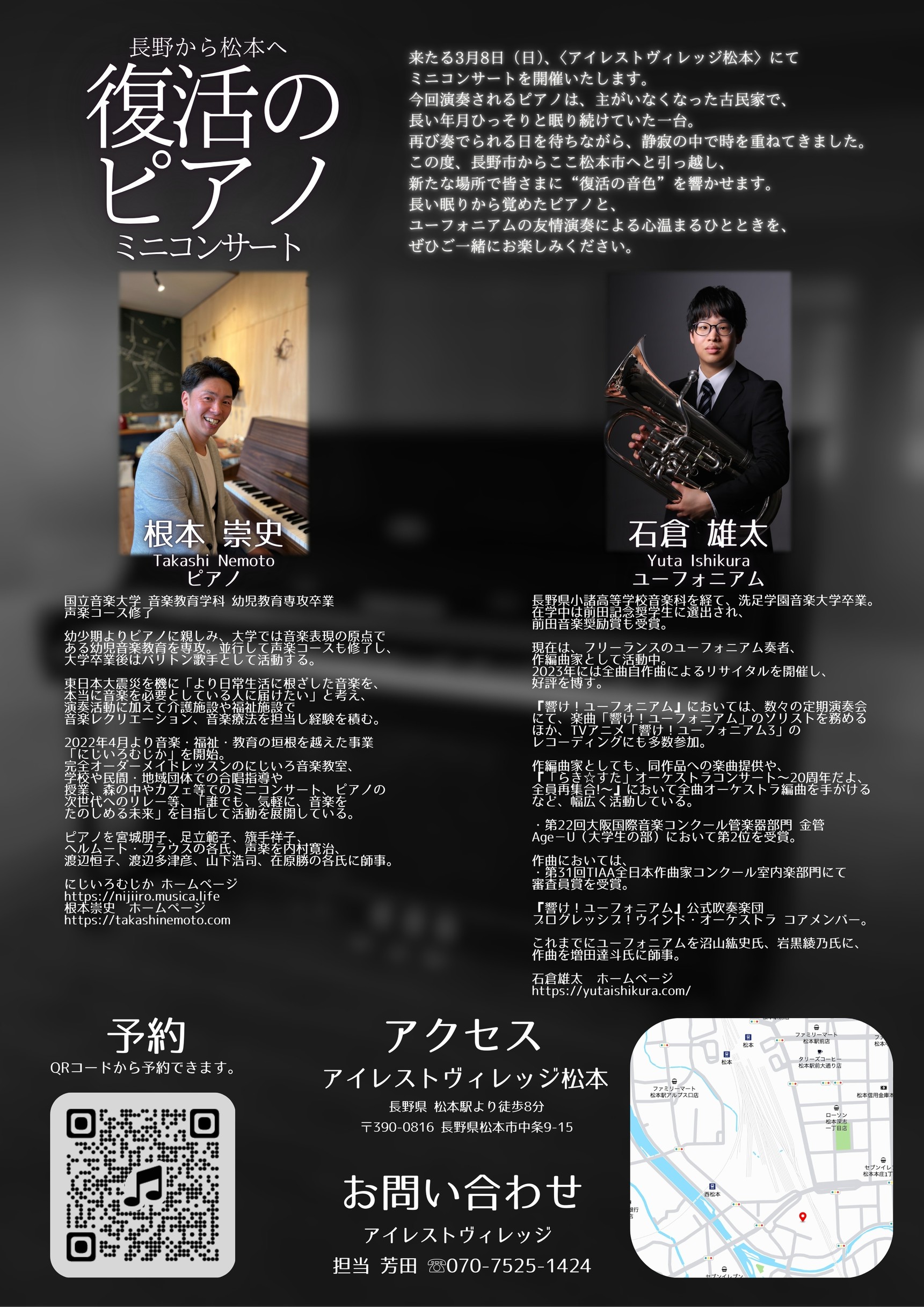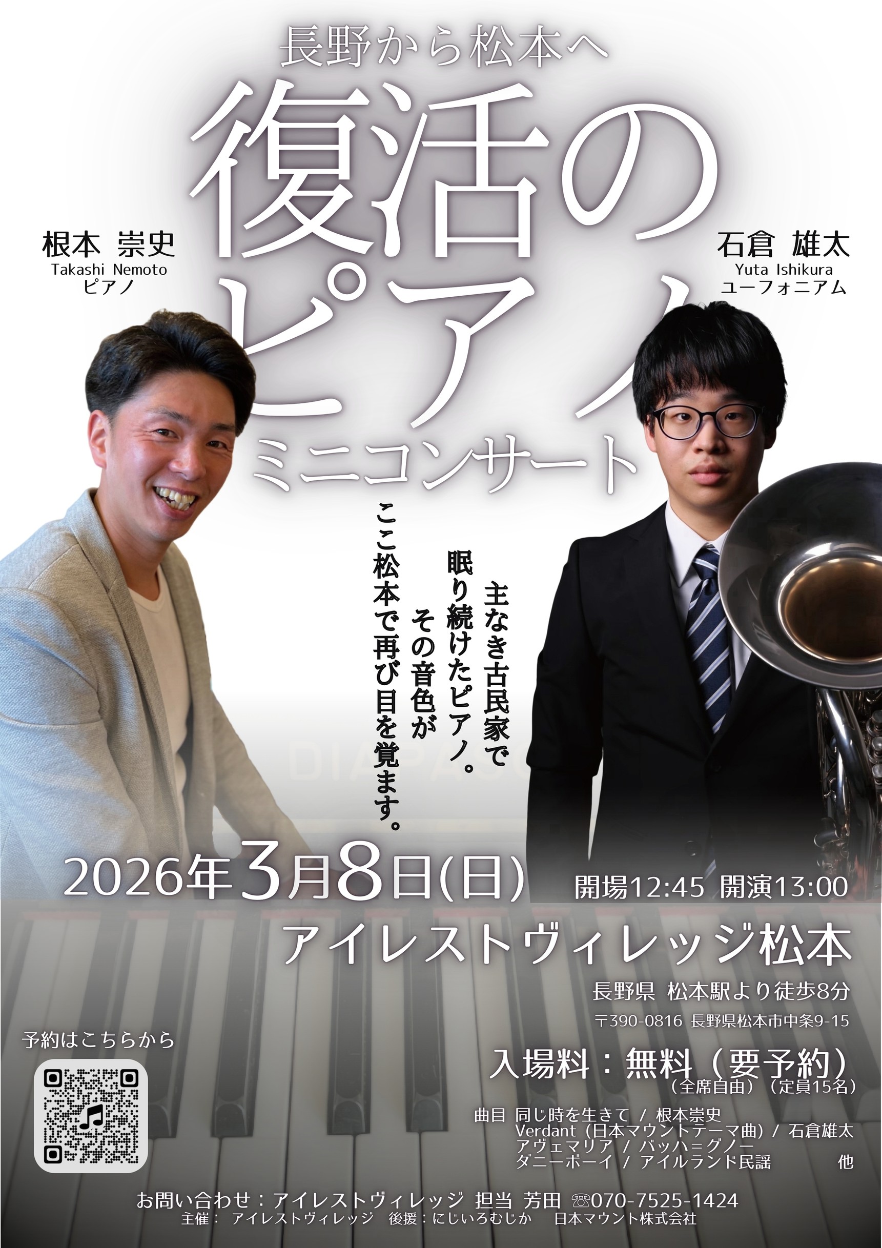 来たる3月8日(日)、アイレストヴィレッジ松本にて、ミニコンサートを開催する運びとなりました。